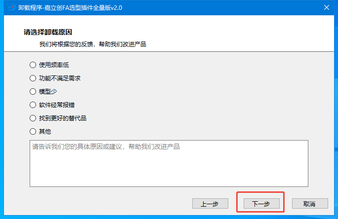 3.烦请选择或输入卸载原因,我们好了解需要改进的地方,继续打磨更好的产品,然后点击下一步