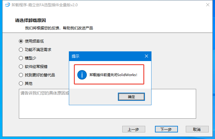 4.友好提示卸载前请关闭SolidWorks软件,防止卸载失败