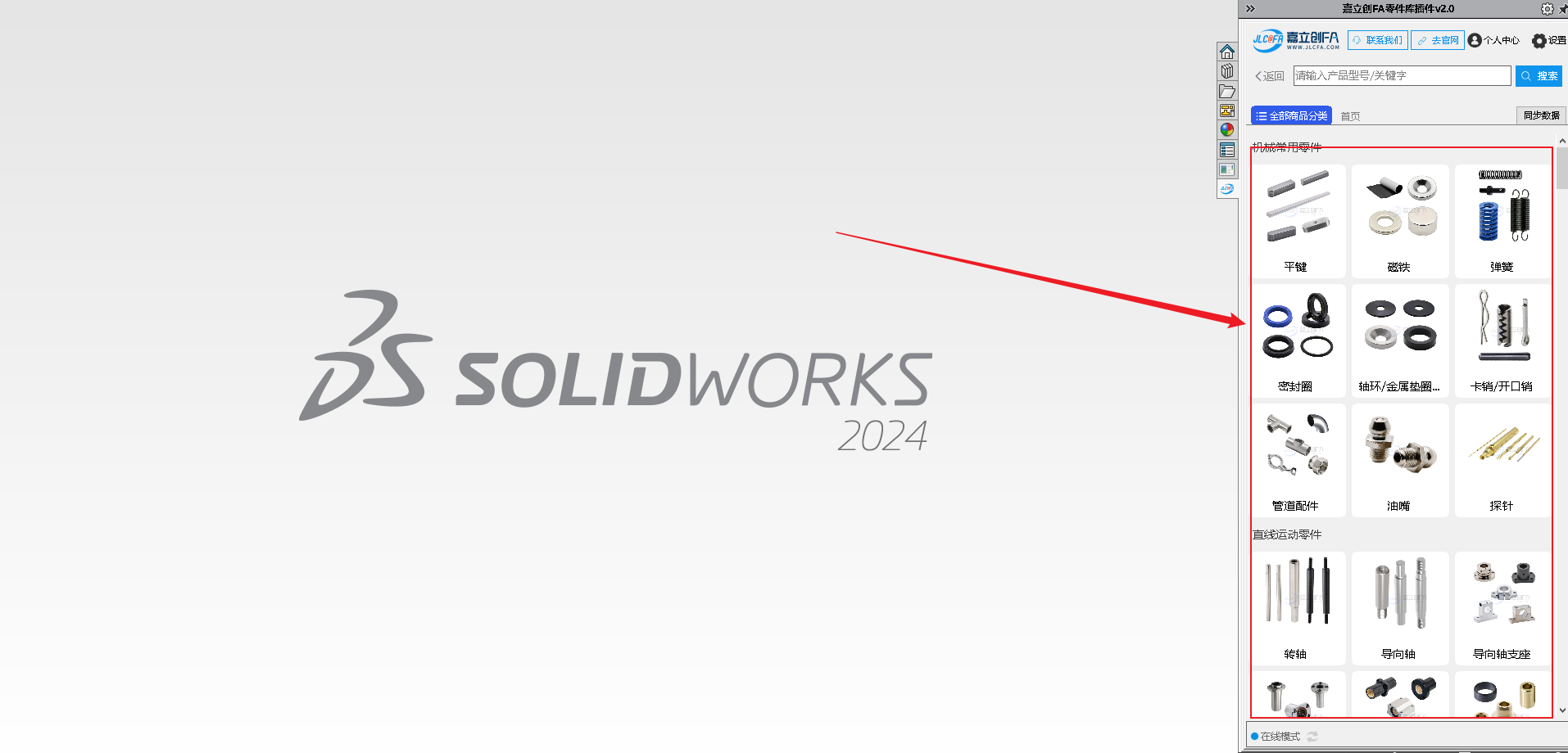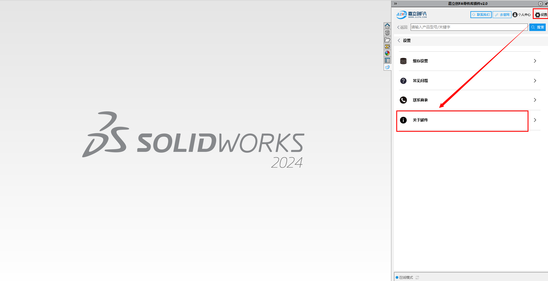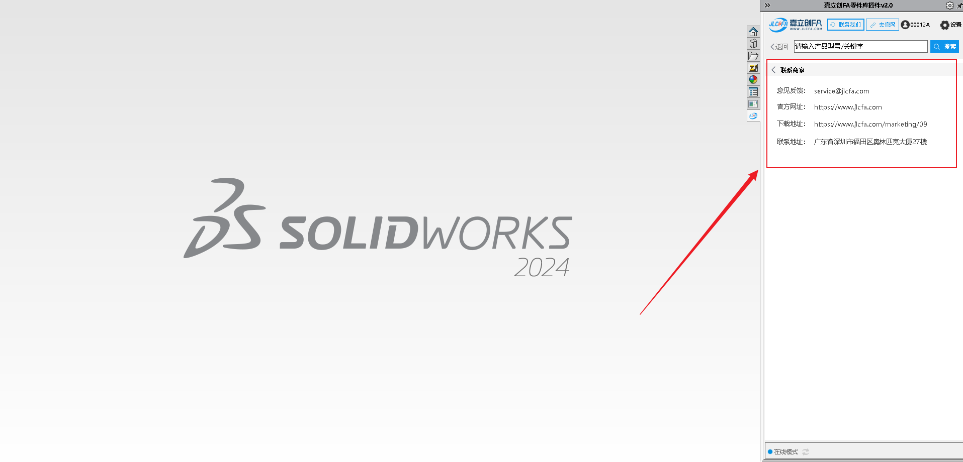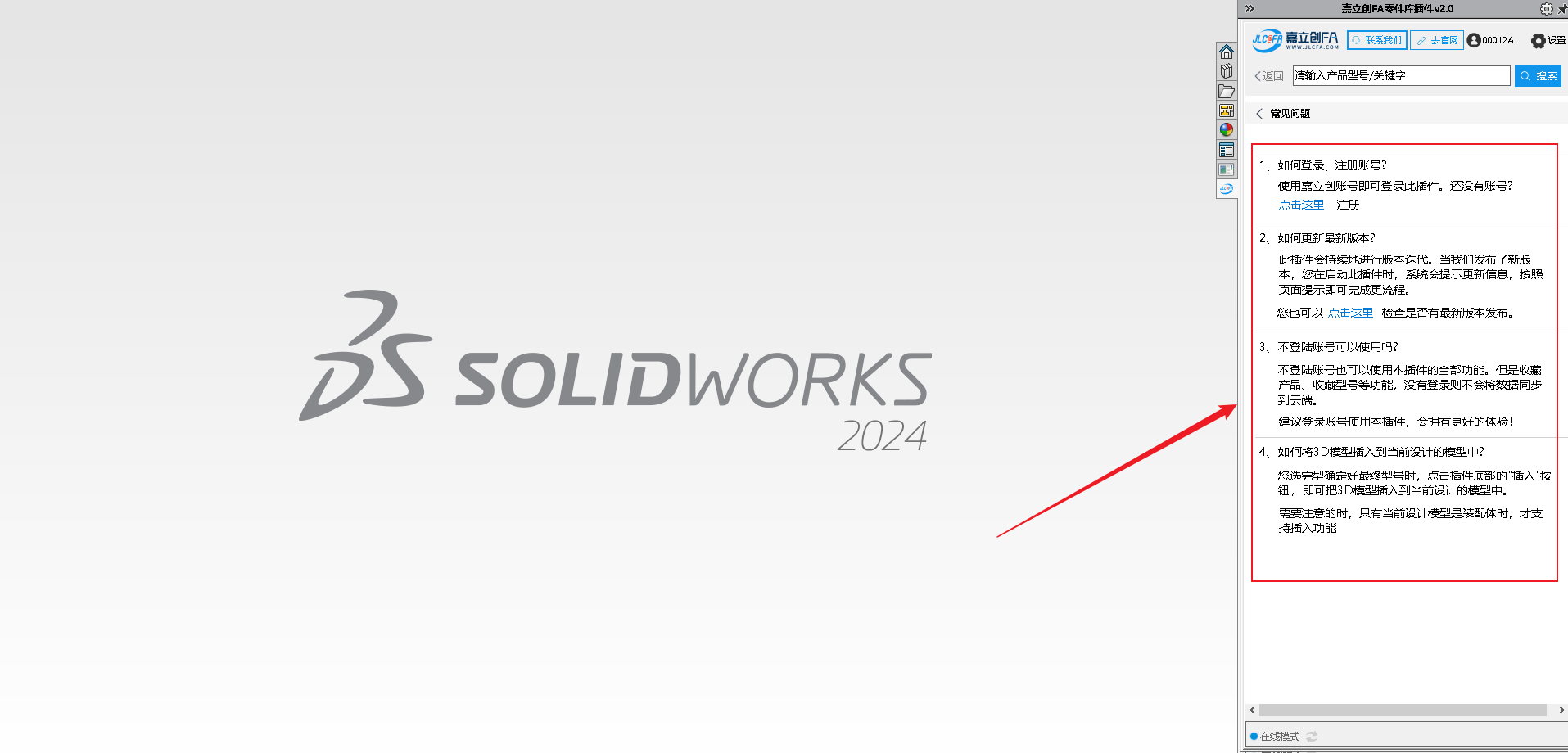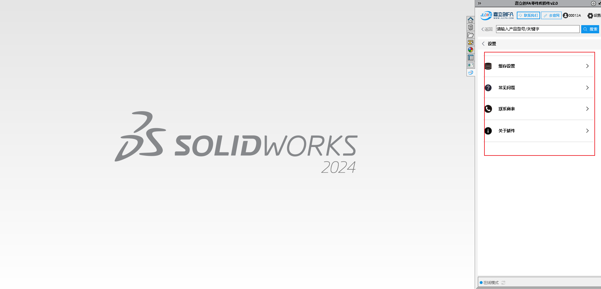 9.安装完成后打开SW软件,查看右侧菜单图标,可查看到对应的嘉立创FA选型插件图标