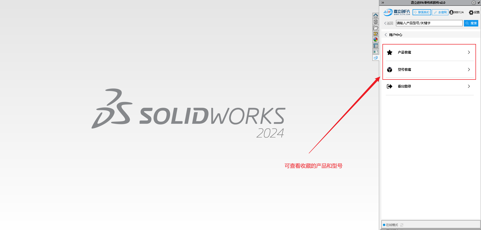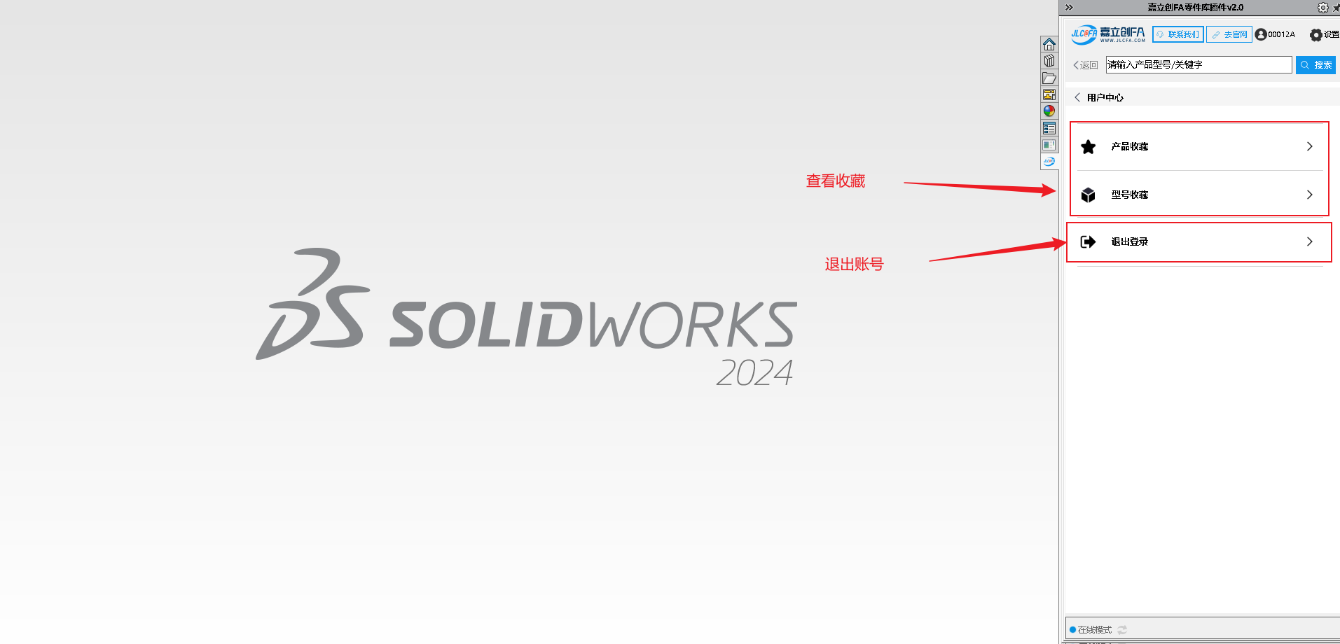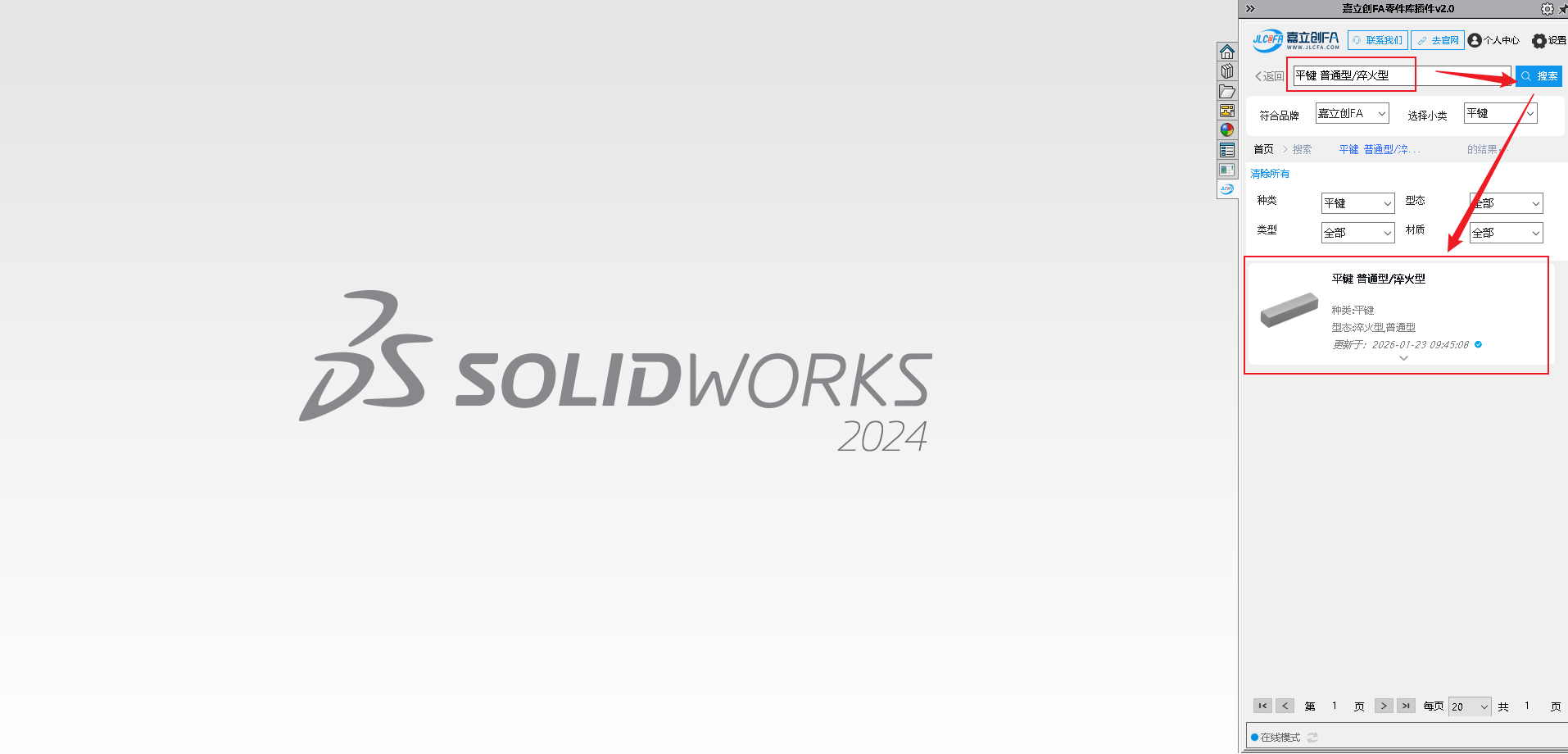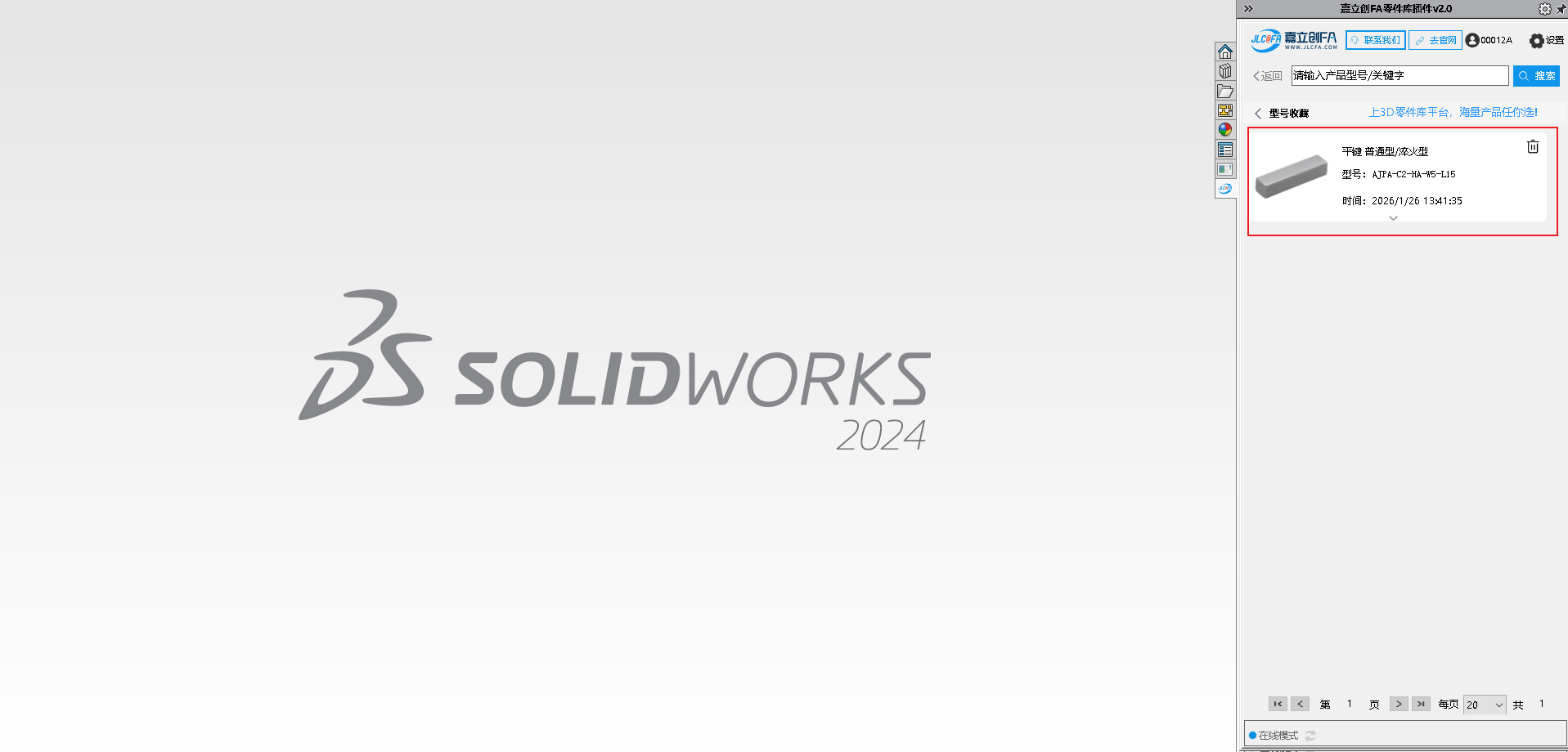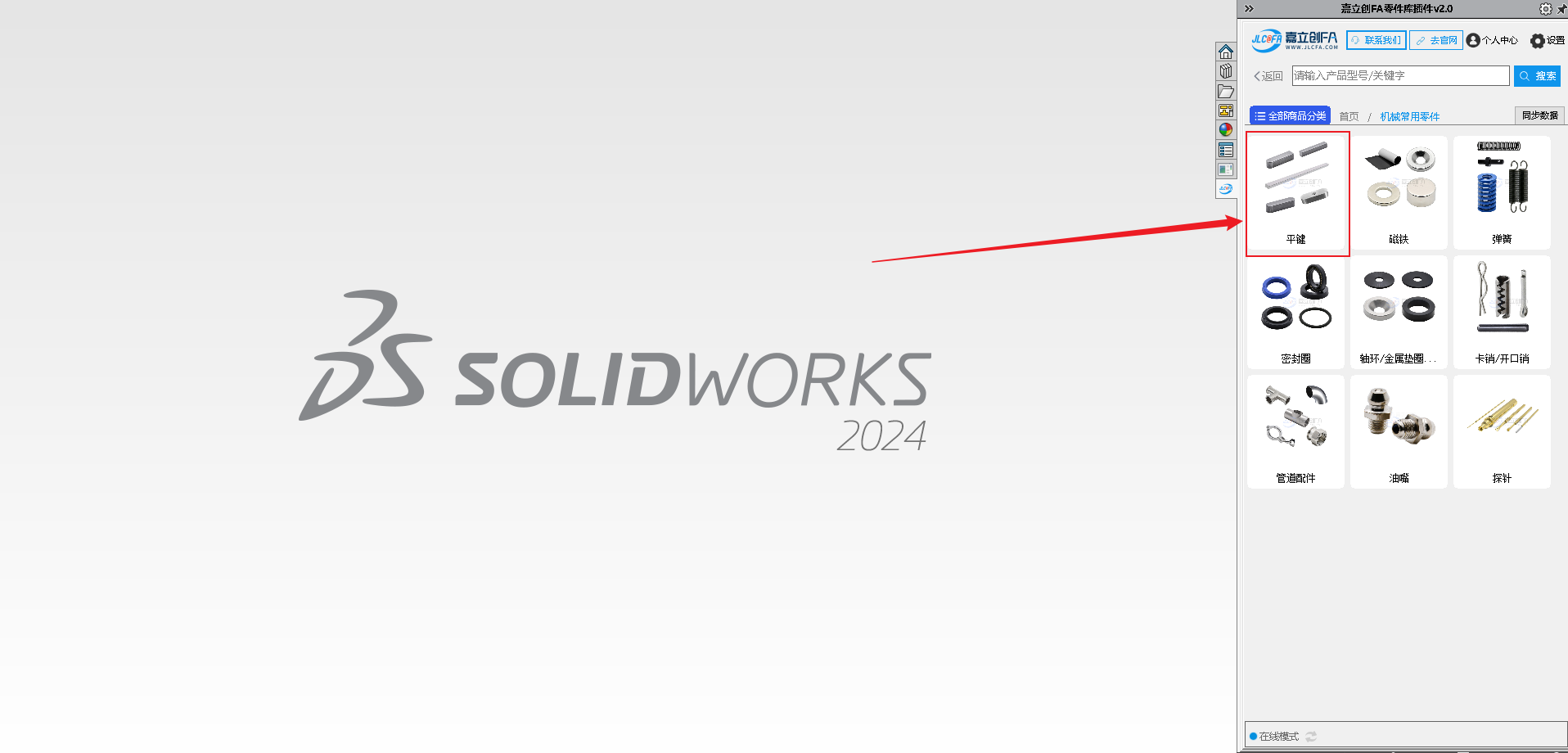 9.安装完成后打开SW软件,查看右侧菜单图标,可查看到对应的嘉立创FA选型插件图标