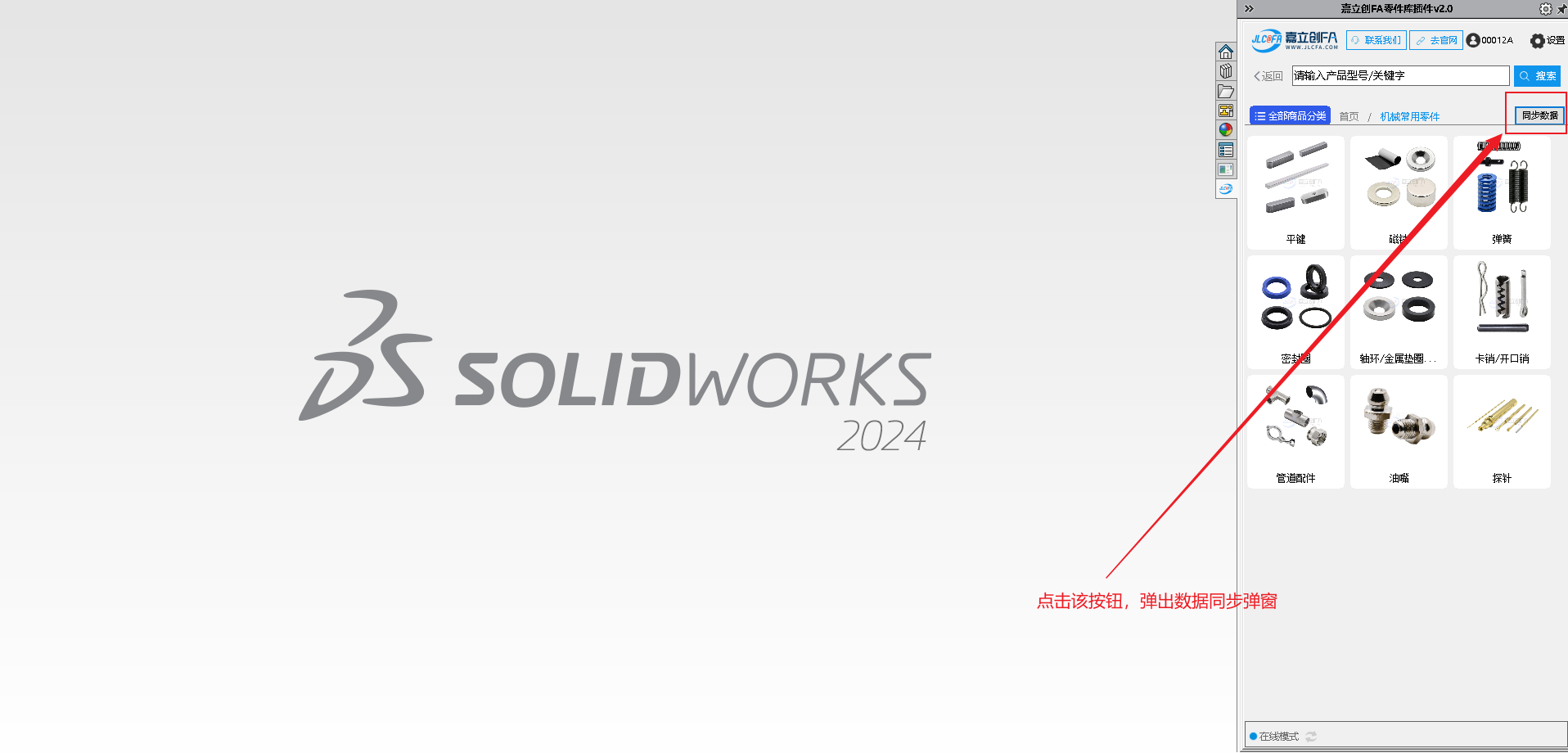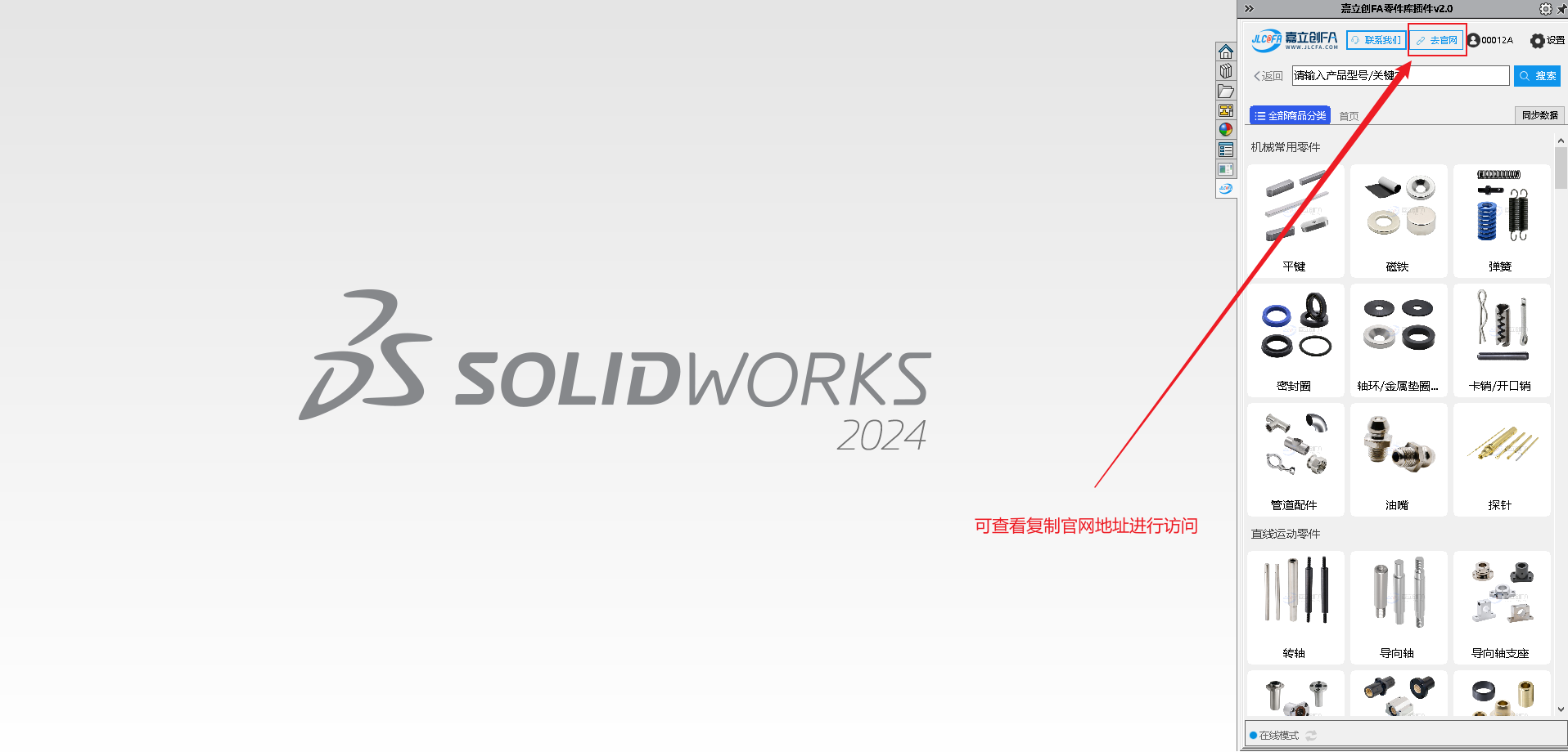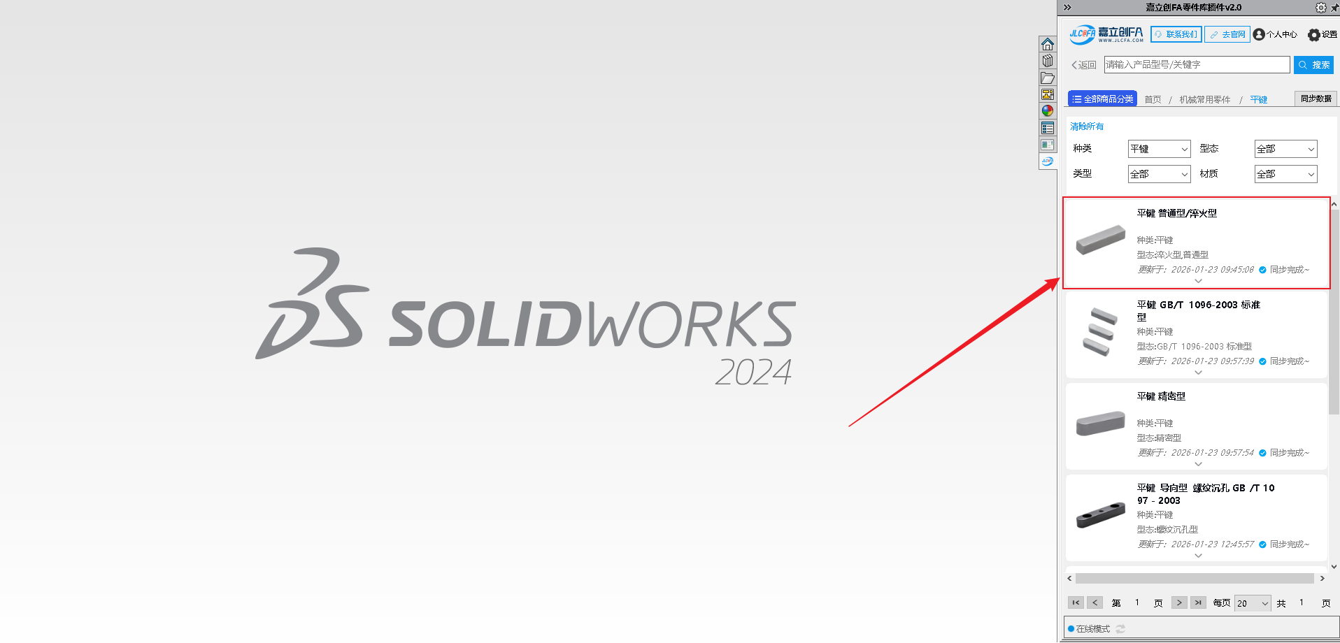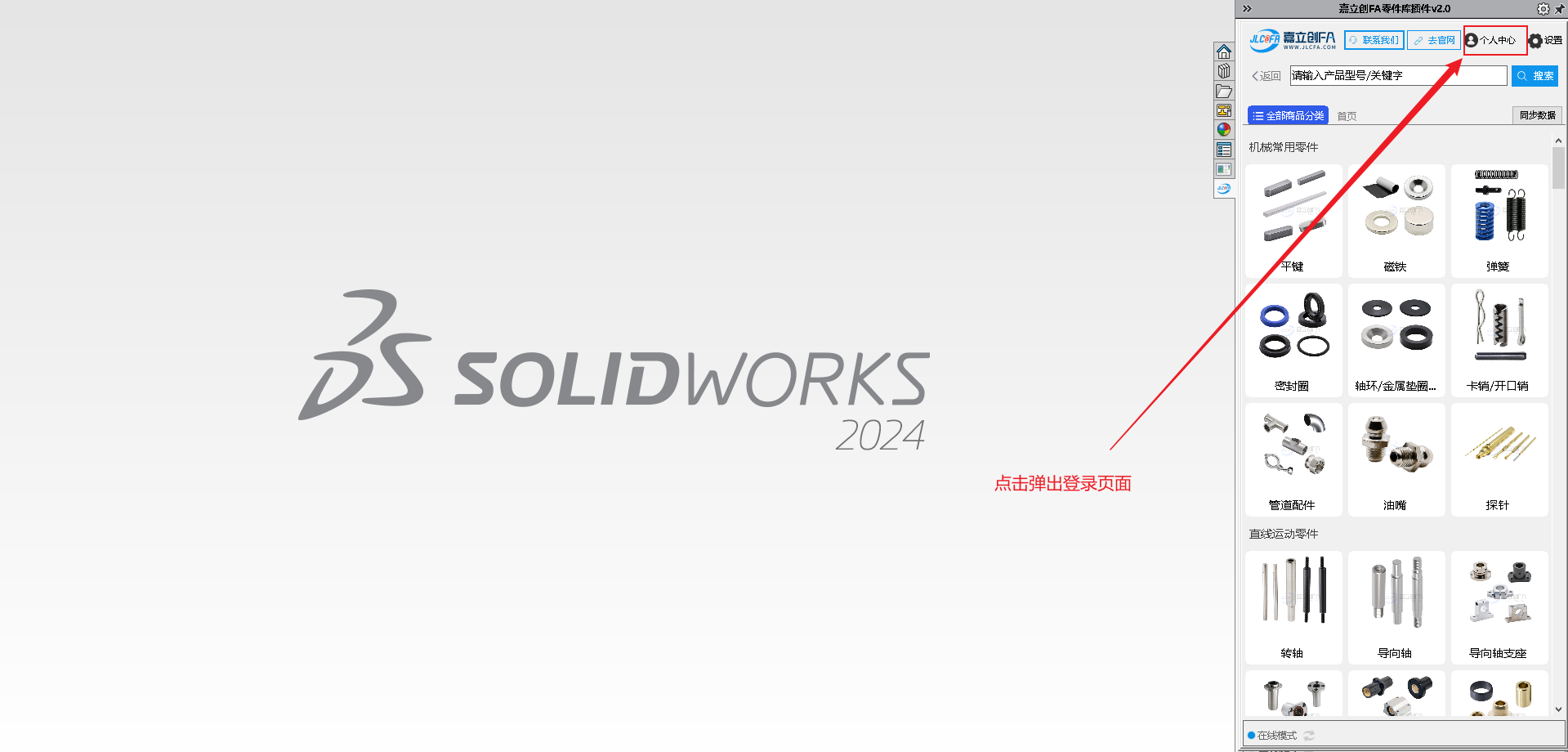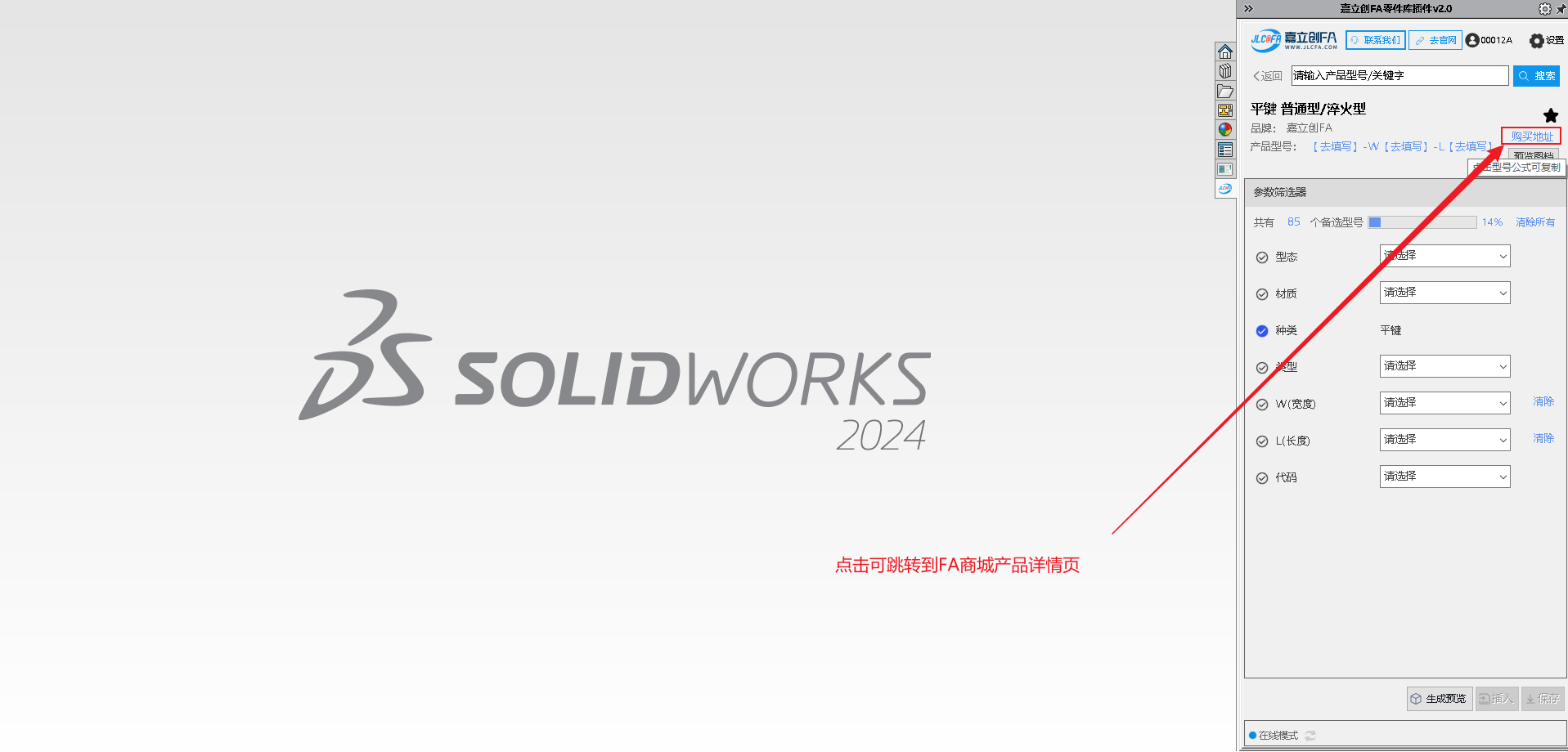 9.安装完成后打开SW软件,查看右侧菜单图标,可查看到对应的嘉立创FA选型插件图标