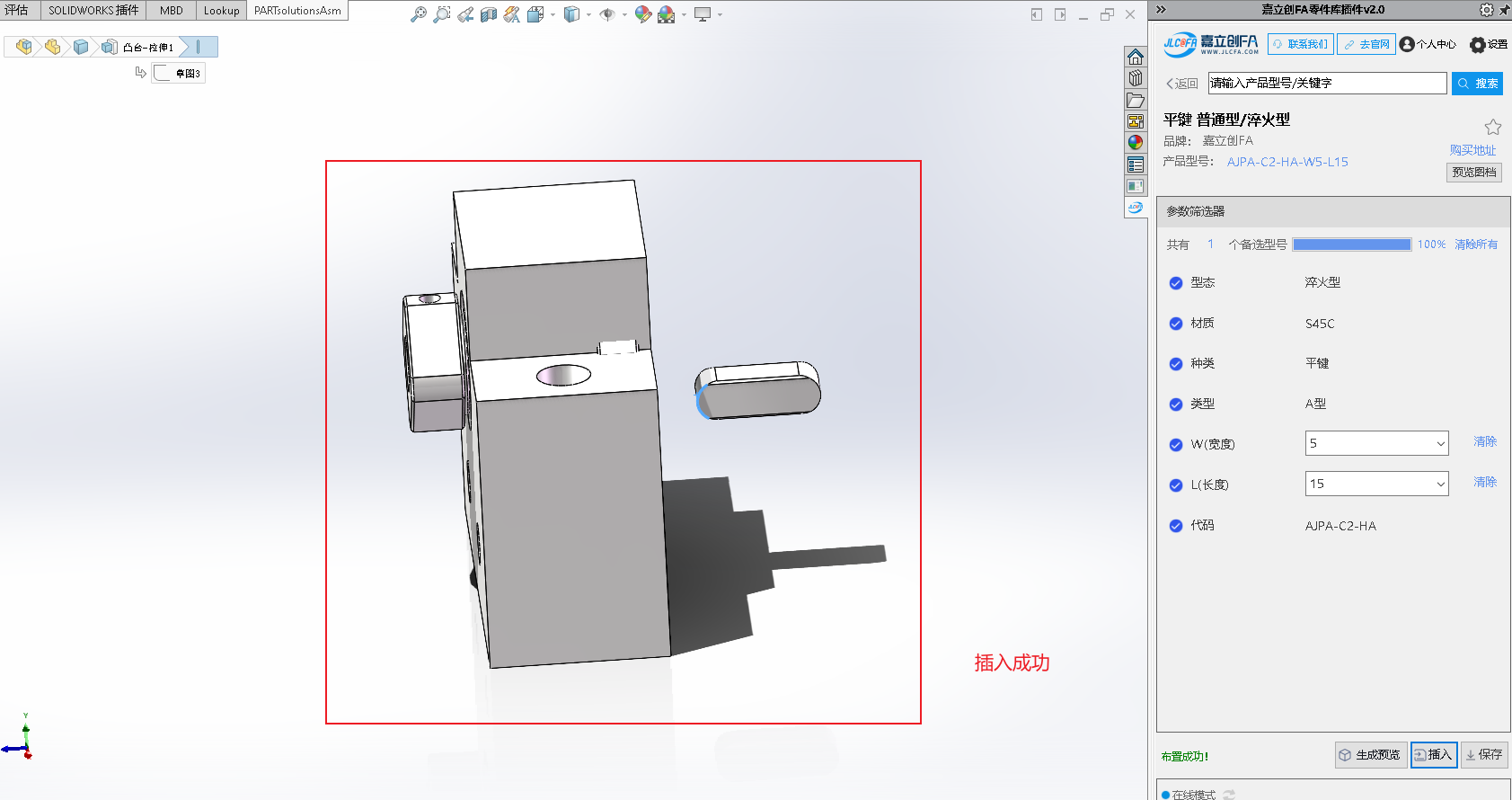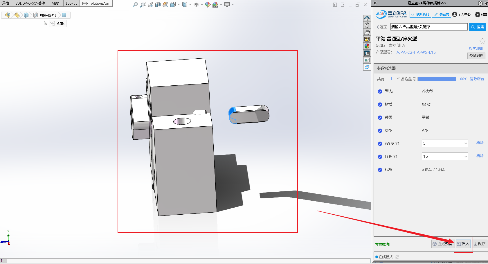 2.打开你的装配体(.SLDASM)模型,点击右下角的“插入”,将当前选型100%的模型,插入到你的装配体中,如下: