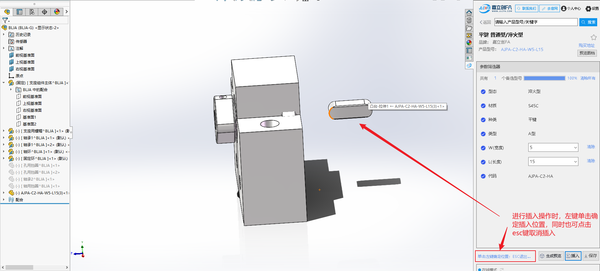 3.将模型插入到当前装配体之后,要插入的模型会跟随鼠标移动,这时候单击鼠标左键,可将模型放置到鼠标点击的位置;点击esc退出放置模型,取消插入模型操作